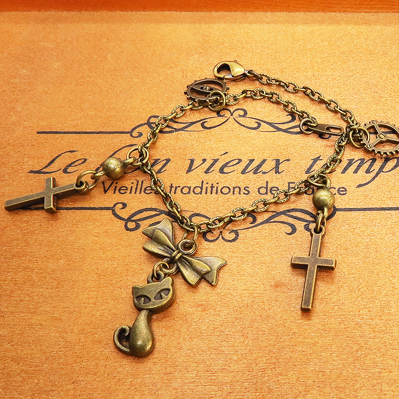 しっくりと馴染み落ち着きのあるアンティークカラーでまとめた、猫と歯車、ロザリオのスチームパンク風のブレスレットです