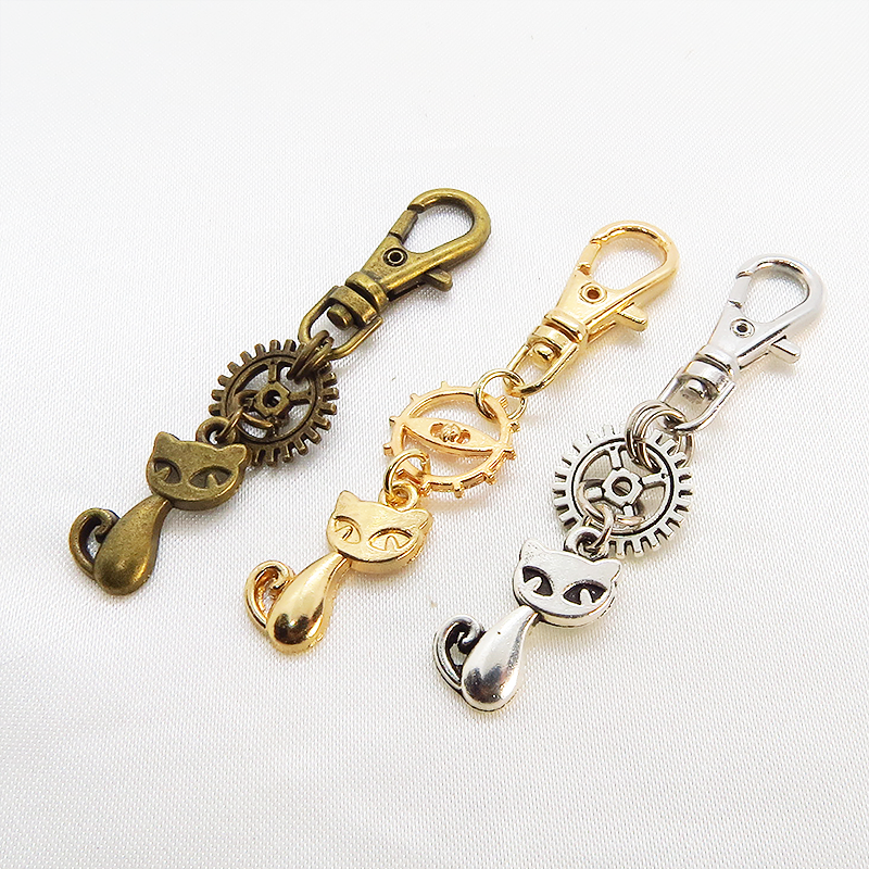 猫とギア・歯車で構成された、スチームパンク風のシンプルに一個ずつで構成したファスナーチャーム・キーホルダーです