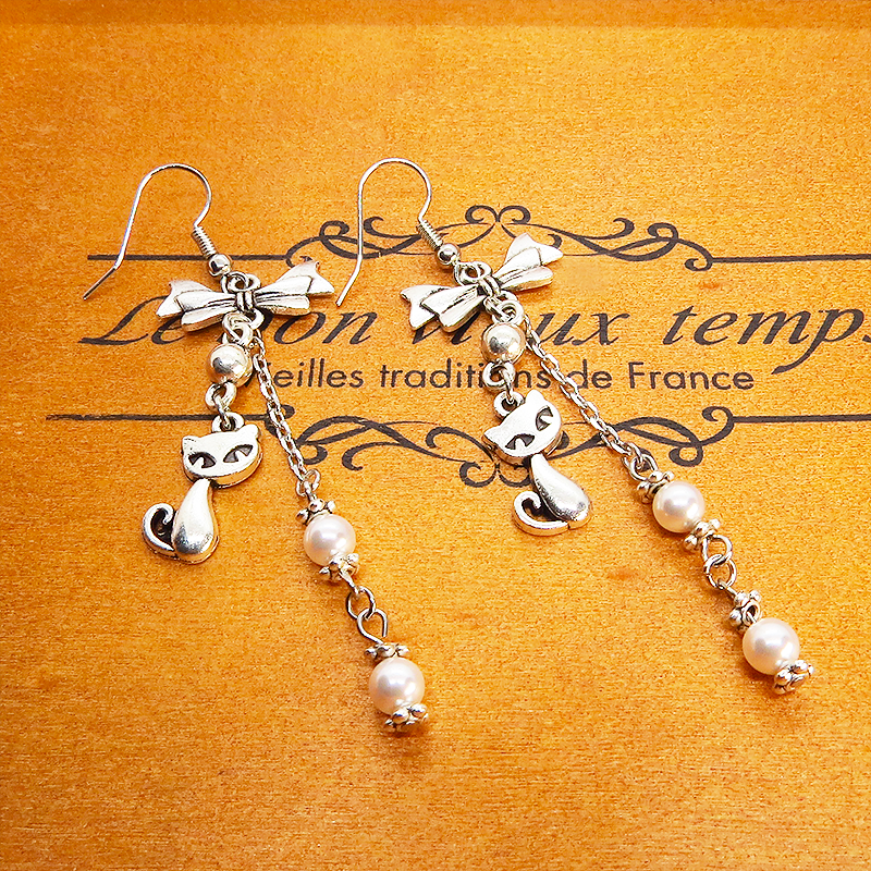 アンティークシルバーの猫とリボンのモチーフに、スワロフスキーパールで組み上げたビーズをつなげたチェーンをあわせたロングチェーンピアスです