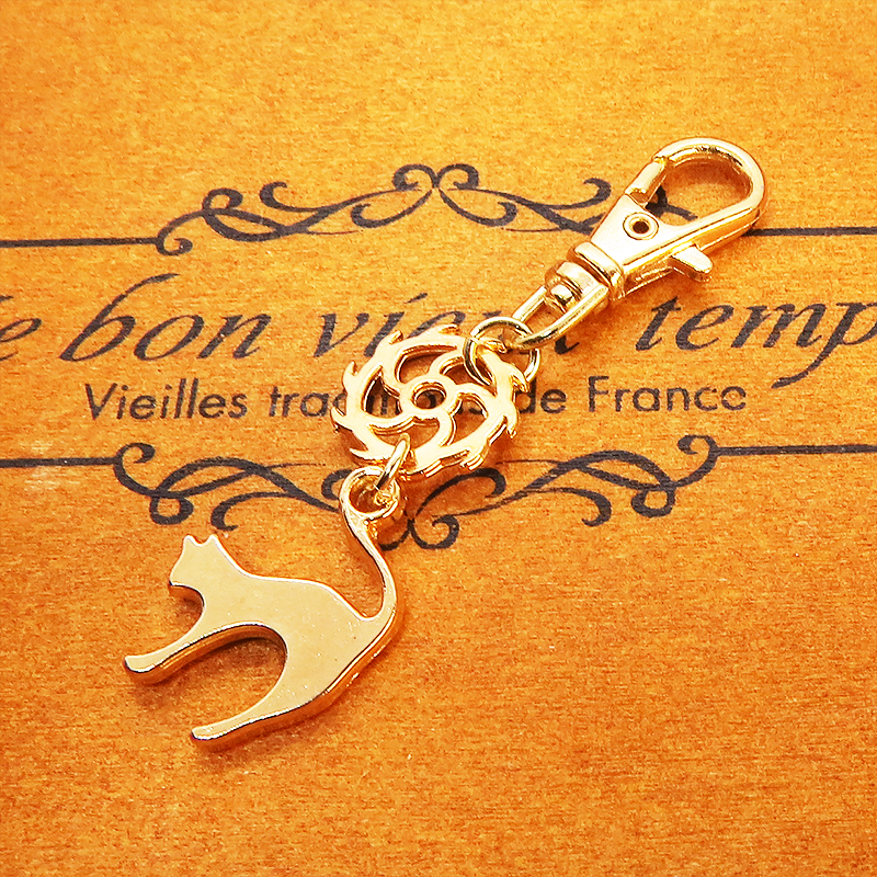 マットゴールドの跳ね猫とちょっとかっこいい歯車の大人可愛いファスナーチャーム キーホルダー マスクチャーム