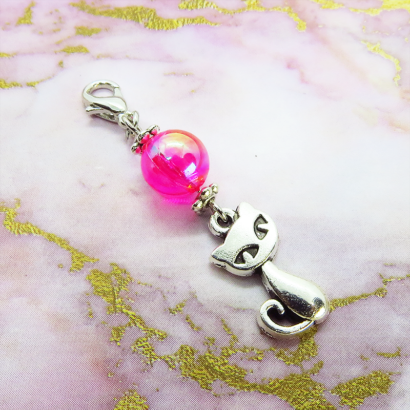 アンティークシルバーの可愛い猫モチーフにマゼンダのビーズを組合せたマスクチャームです
