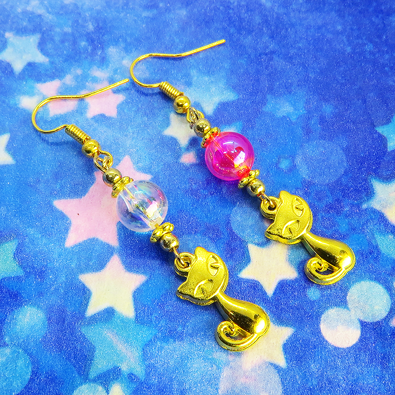 ゴールドカラーの可愛い猫モチーフに、マゼンダとクリアのビーズを組合せたピアスです