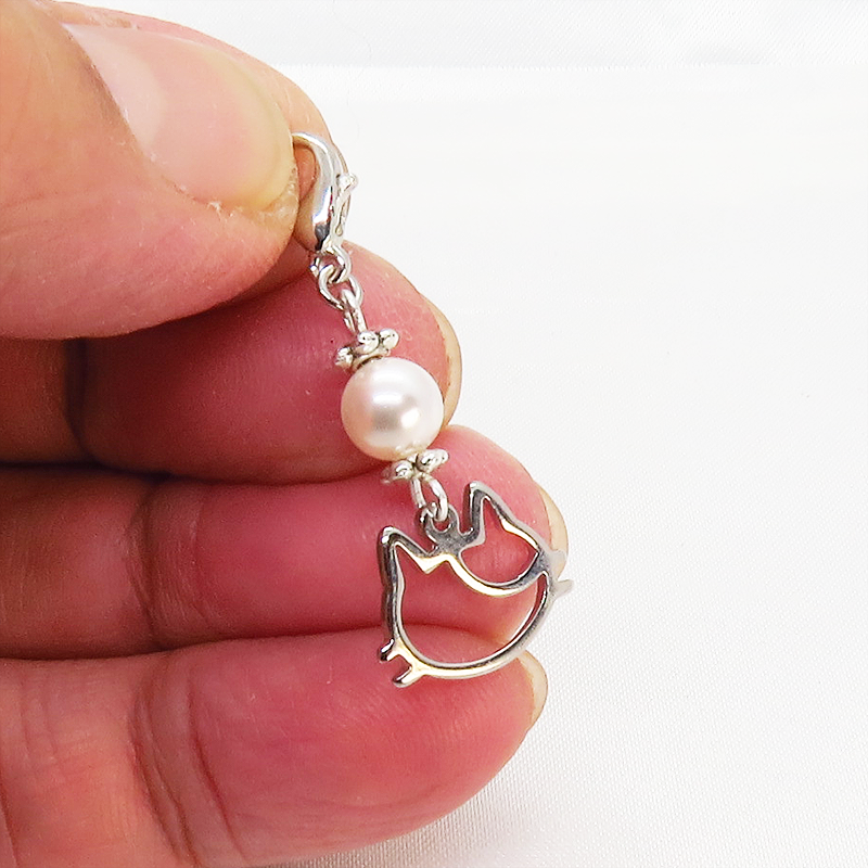 マスクチャーム 三毛猫フェイスモチーフとスワロフスキーパールチャーム シルバーカラー