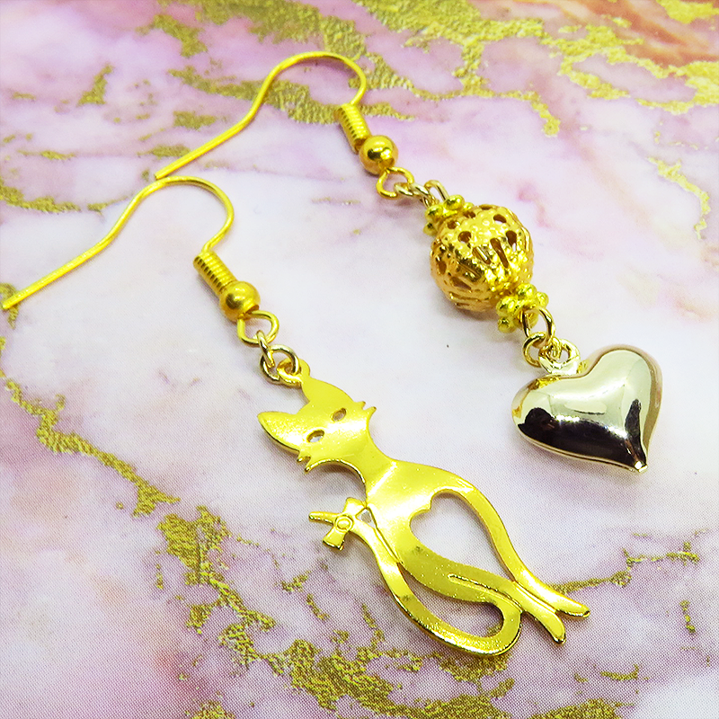 スマートな猫シルエットモチーフとハートのアシンメトリーピアス 透かしメタルビーズ ゴールドカラー