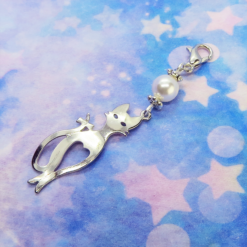 マスクチャーム シルバーカラーのスマートな猫シルエットモチーフとスワロフスキーパールのチャーム
