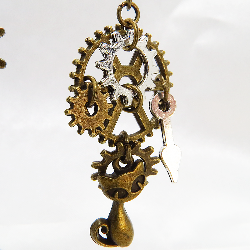猫とロザリオを歯車にそれぞれ組み合わせた、スチームパンク風のアシンメトリーピアスです