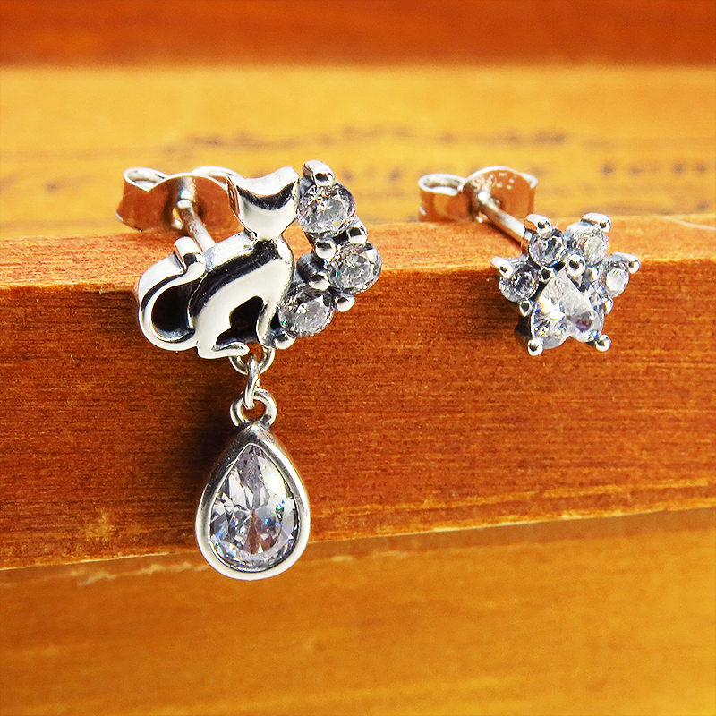 シルバー925 猫シルエットモチーフにキュービックジルコニアのしずくドロップと肉球のパヴェセットアシンメトリーピアス