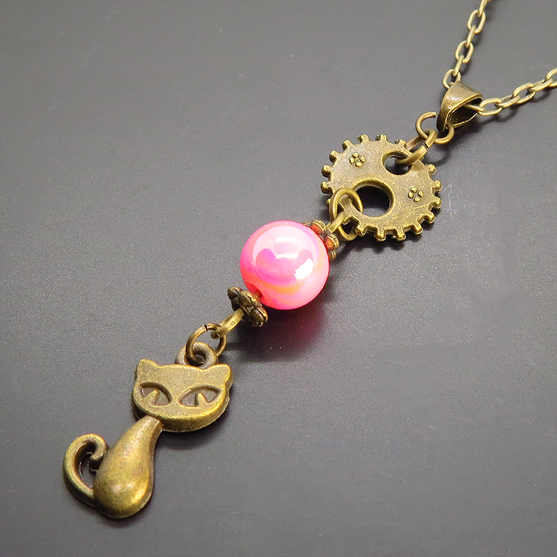 アンティークカラーの猫と歯車のモチーフにピンクのビーズを組み合わせたシンプルな可愛いネックレスです