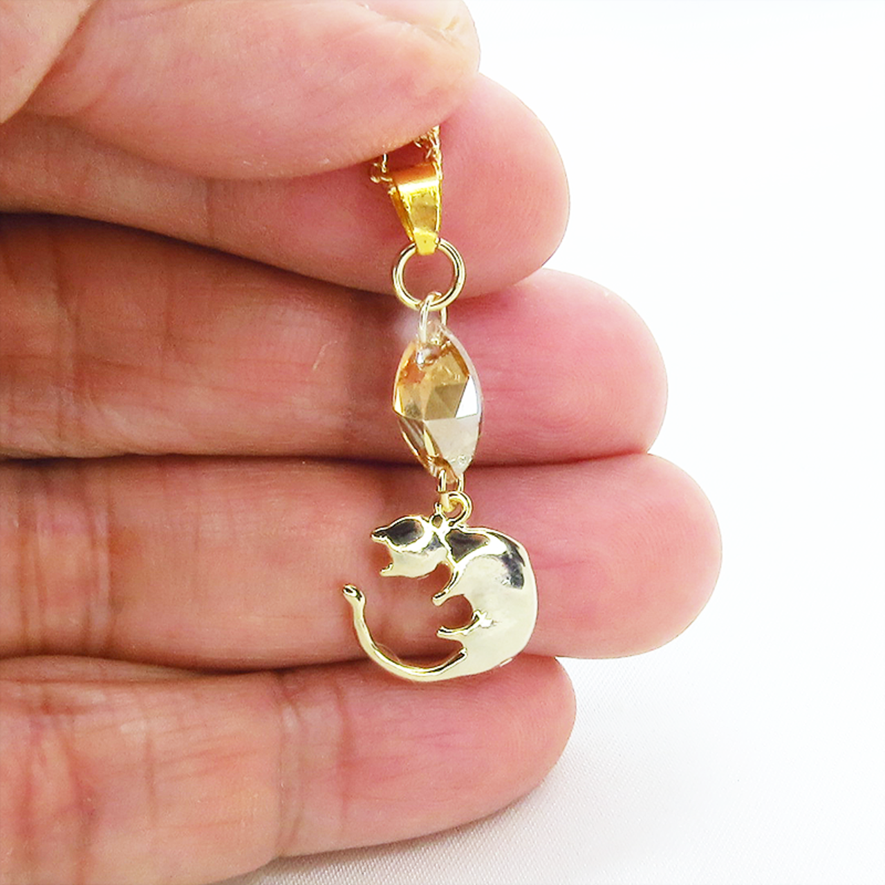 丸くなってる可愛い猫モチーフと大きめスワロフスキー・クリスタル(ゴールドシャドー)のネックレス ゴールドカラー