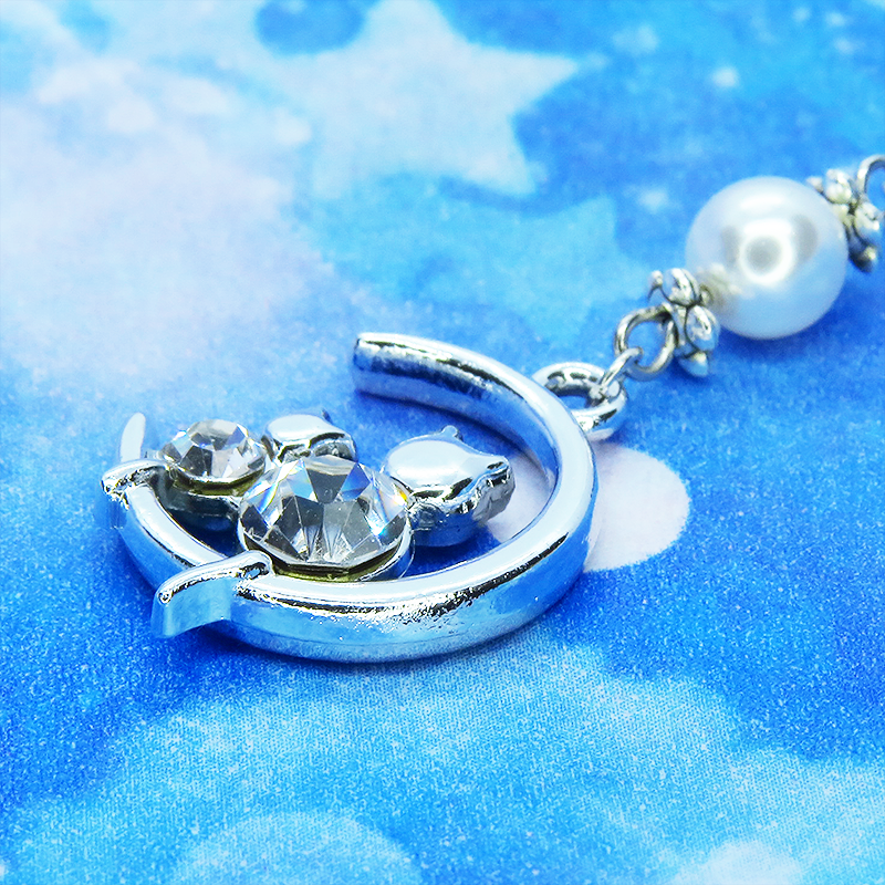 三日月に乗る親子が寄り添う猫モチーフのネックレス シルバーカラー スワロフスキーパール ラインストーン