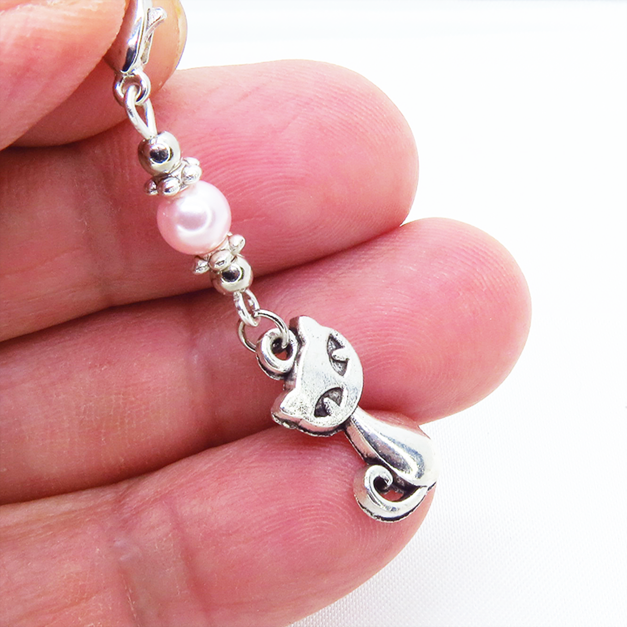 シルバーカラーの猫シルエットモチーフにロザリン(淡いピンク)色のスワロフスキーパールを組み合わせたコンパクトなチャームです