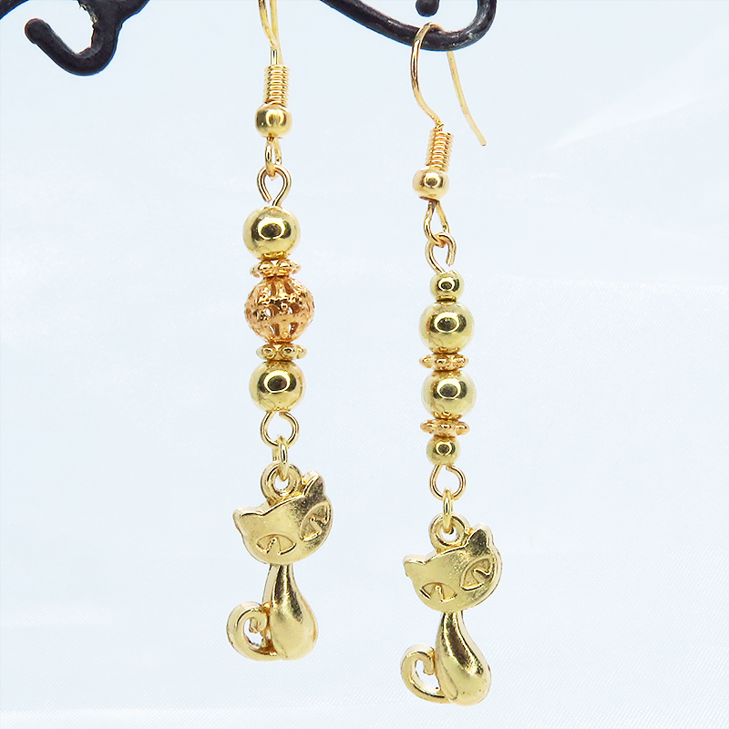 マットゴールドカラーの猫モチーフとメタルビーズを組み合わせたスリムでシンプルなピアスです