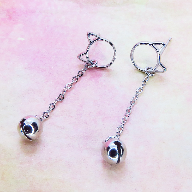 シルバー925の猫フェイスを象ったモチーフにチェーンをぶら下げ、その先に鈴をつけたチェーン・スタッドピアスです