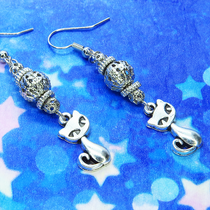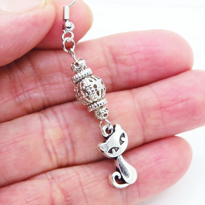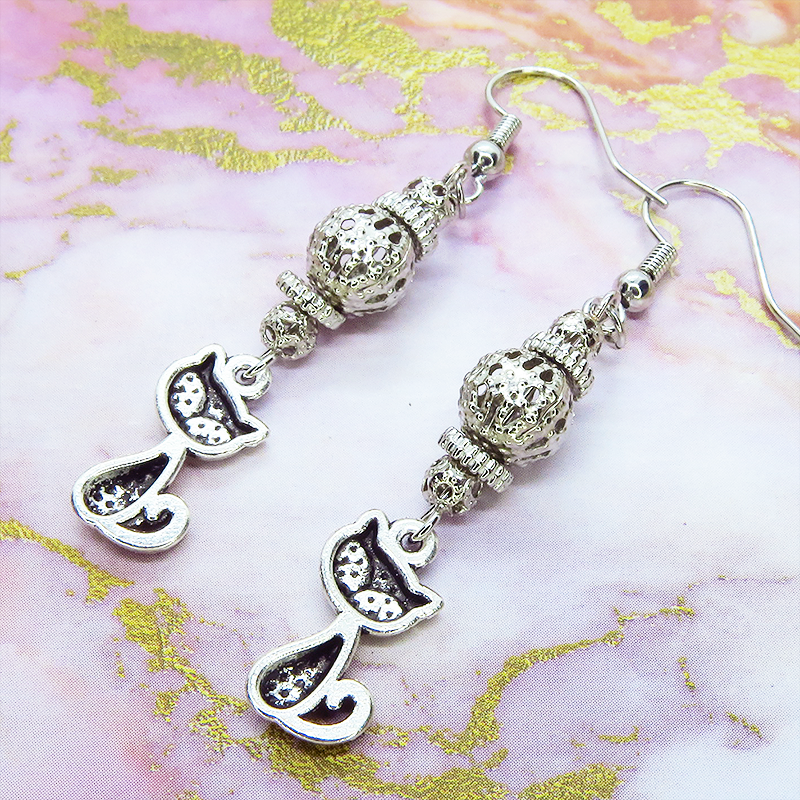 アンティークシルバーの猫とシルバーカラーのメタルビーズを組み合わせたピアスです