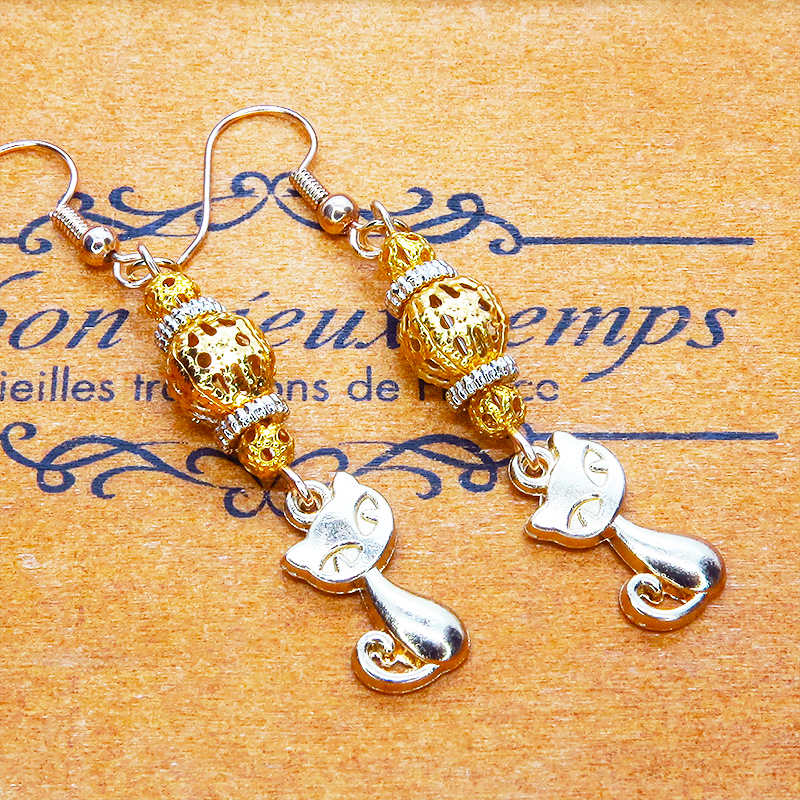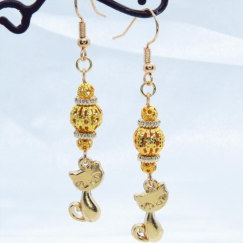ゴールドカラーの猫とメタルビーズを組み合わせたピアス イヤリング