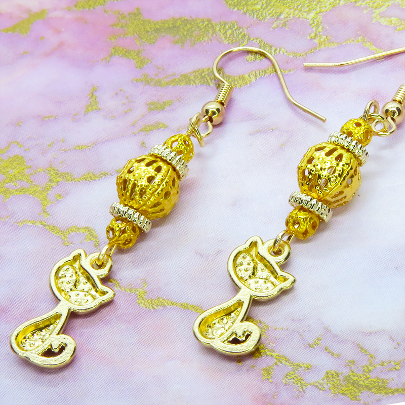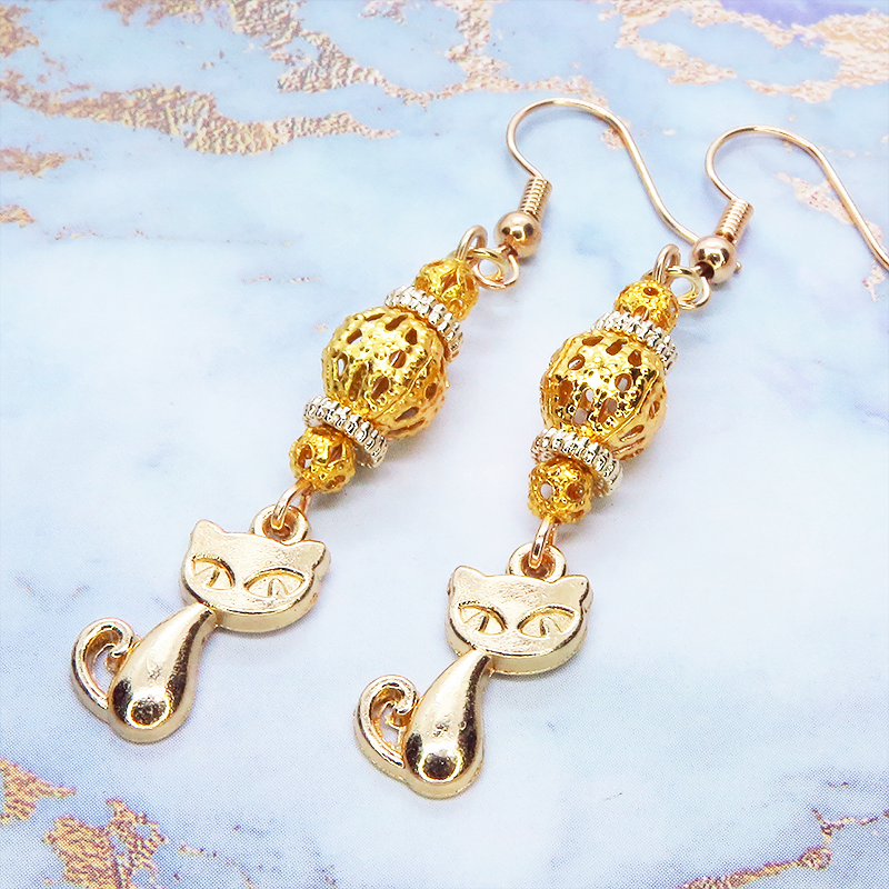 ゴールドカラーの猫とメタルビーズを組み合わせたピアスです