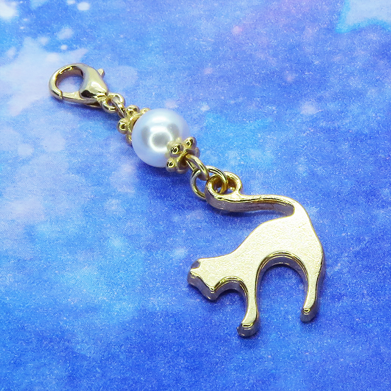 マットゴールドの跳ね猫モチーフとクリスタルホワイトのスワロフスキーパールを組み合わせたチャームです