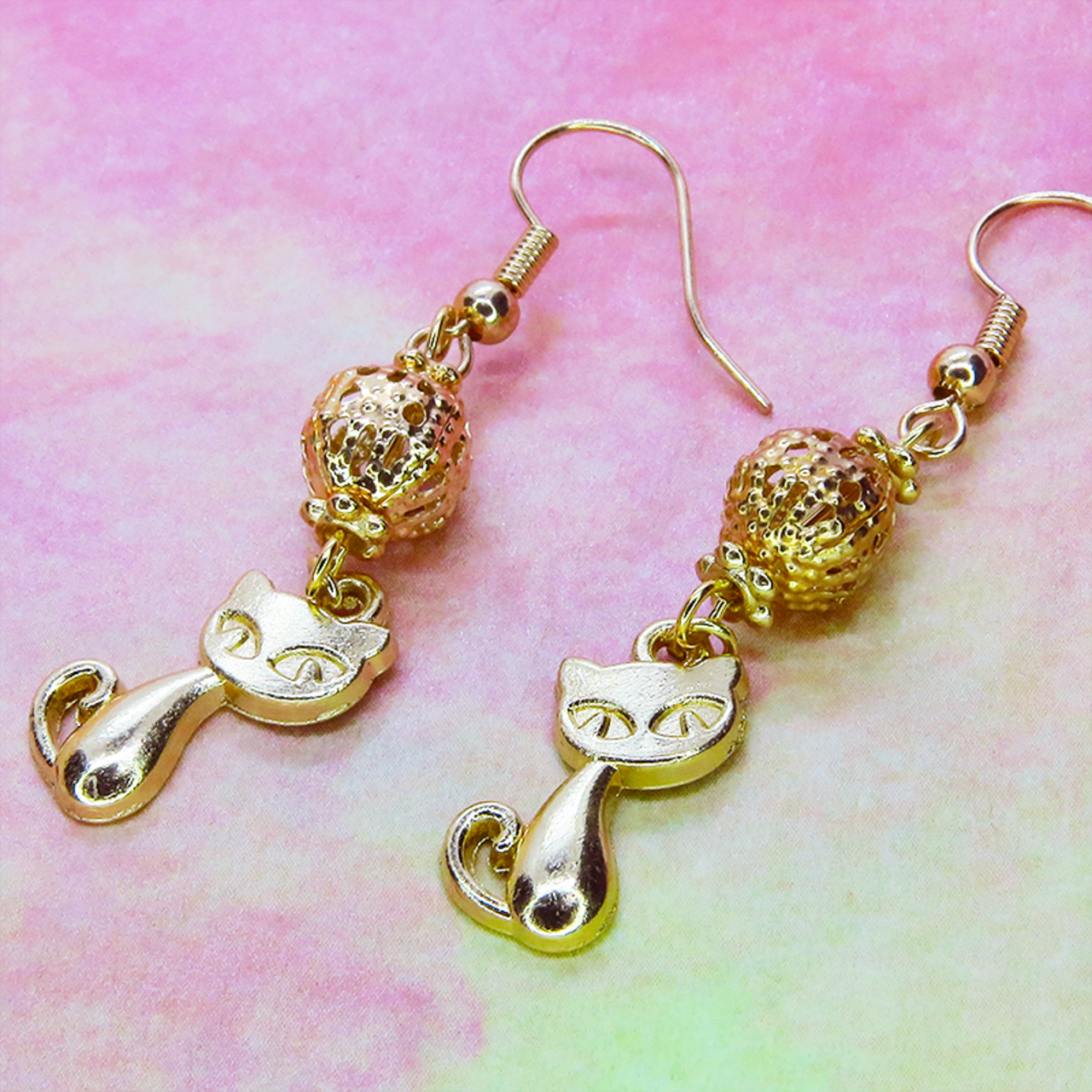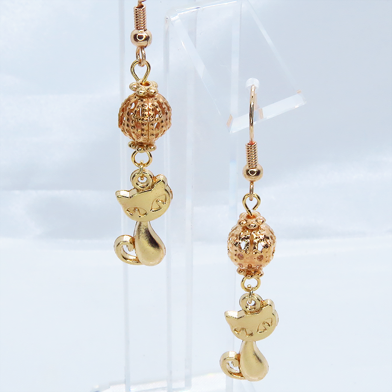 マットゴールドの可愛い猫モチーフとメタルビーズを組み合わせたピアスです