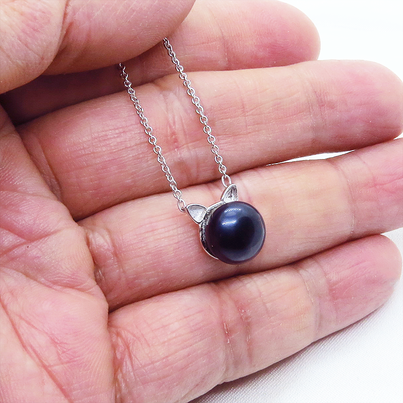 シルバー925 シンプルにさり気なく大人可愛いブラックパール猫耳ネックレス 淡水パール アジャスター追加可