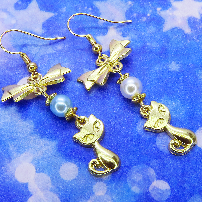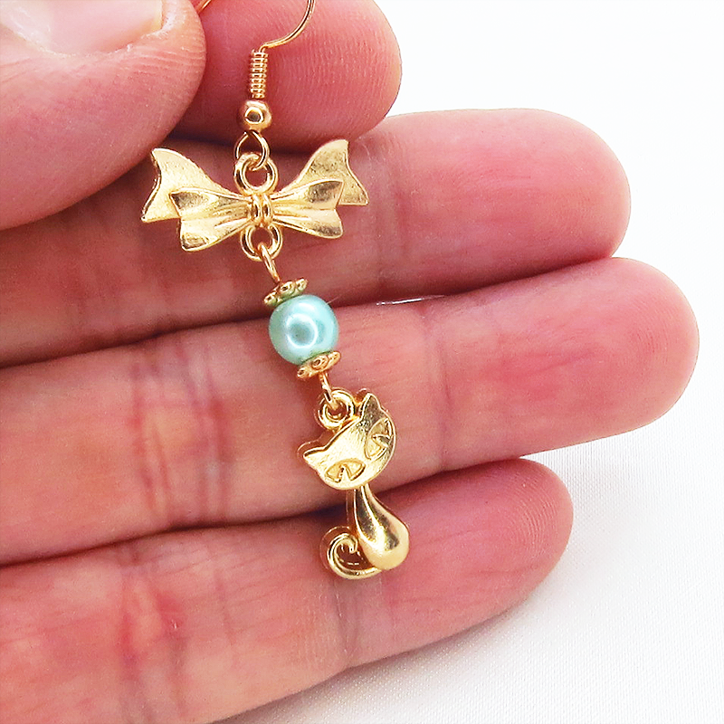マットゴールドの猫とリボンのモチーフに、ホワイトとアクアの2色の組み上げたパールビーズをつなげた大人可愛いピアスです