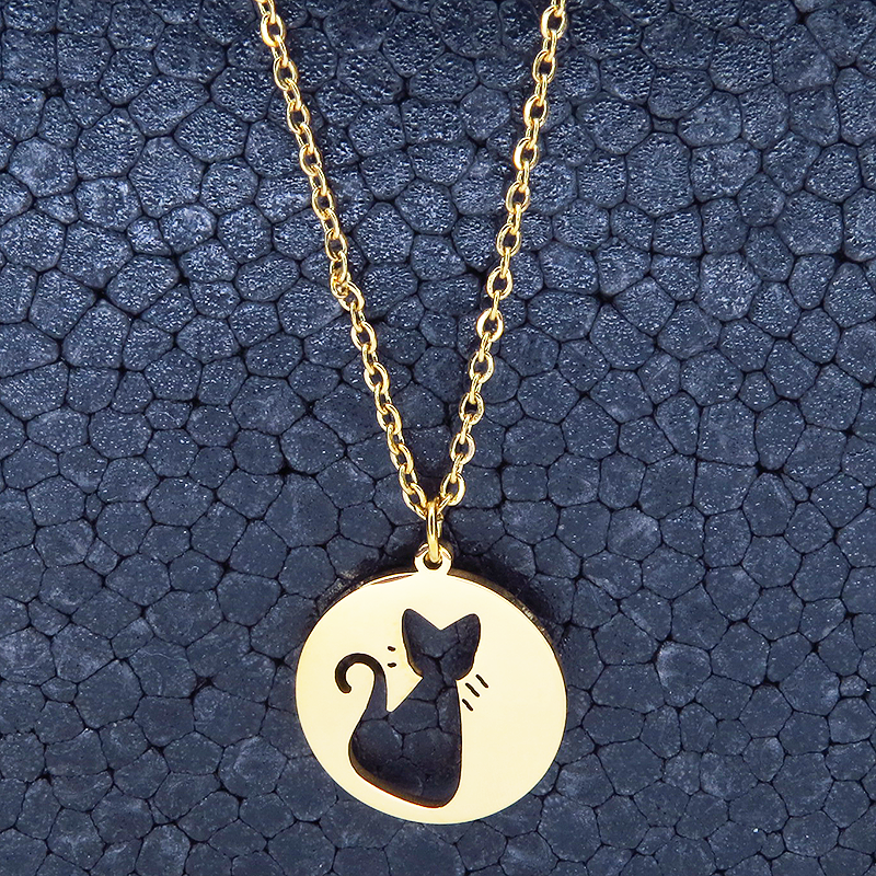 ゴールドカラーの猫シルエットをくり抜いたステンレス製ペンダントネックレスです
