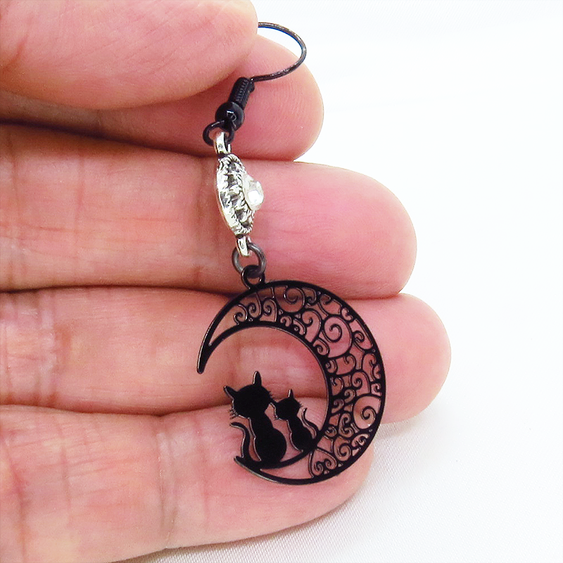 親子の猫がアラベスクのような透かし模様の三日月に乗っているモチーフとラインストーンを組み合わせたゴシック調ブラックピアスです