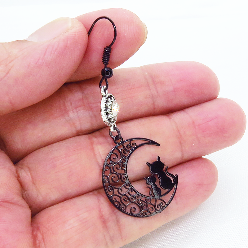 アラベスク調の透かし模様の三日月と親子猫のシルエットモチーフとラインストーンのゴシック調ブラックピアス イヤリング