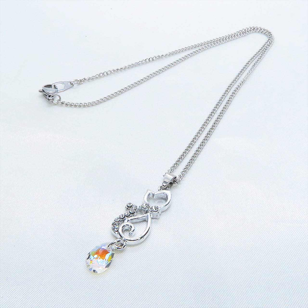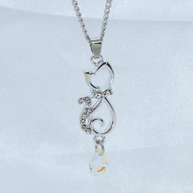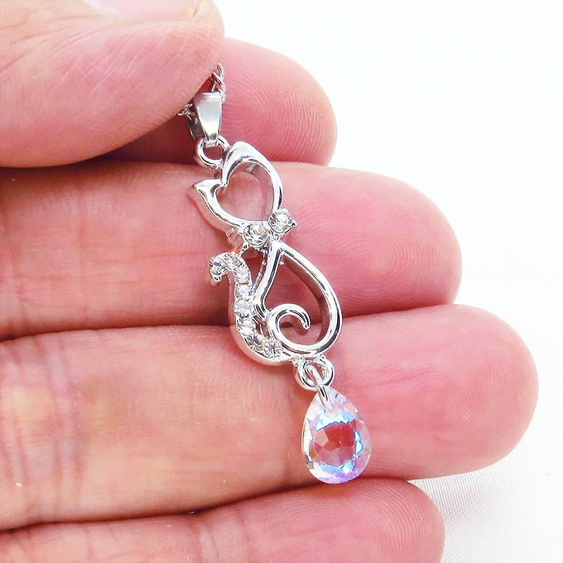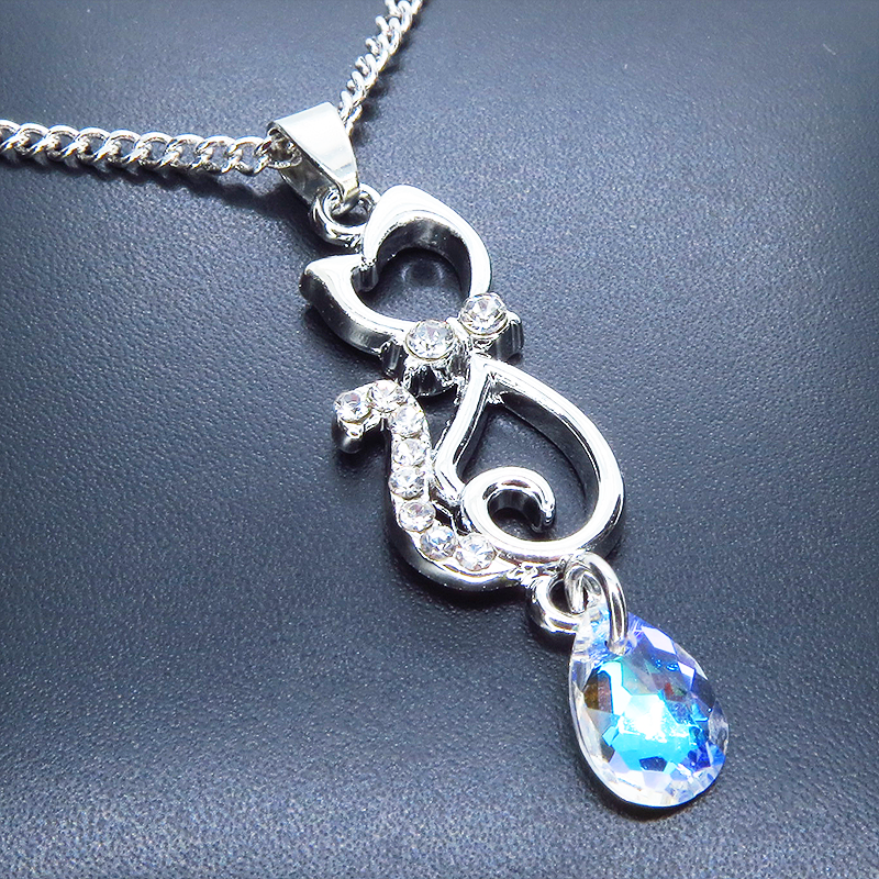 ラインストーンが散りばめられた猫モチーフとティアドロップのガラスクリスタル(クリスタルシャイナー)のネックレス