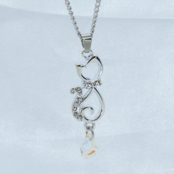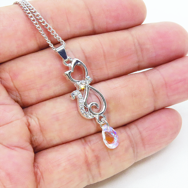 ラインストーンが散りばめられたシルバーカラーの可愛い猫シルエットモチーフと光の加減で輝きが変わるガラスクリスタルをつなげたペンダントネックレスです