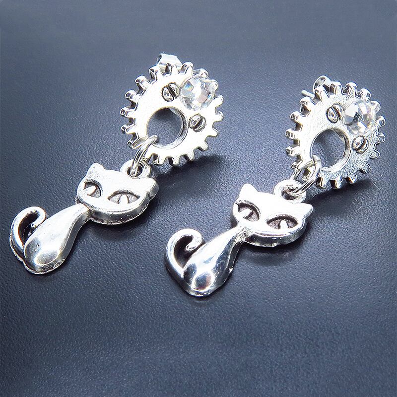 アンティークシルバーの歯車と猫のモチーフをつなげたシンプルなスチームパンク風スタッドピアスです