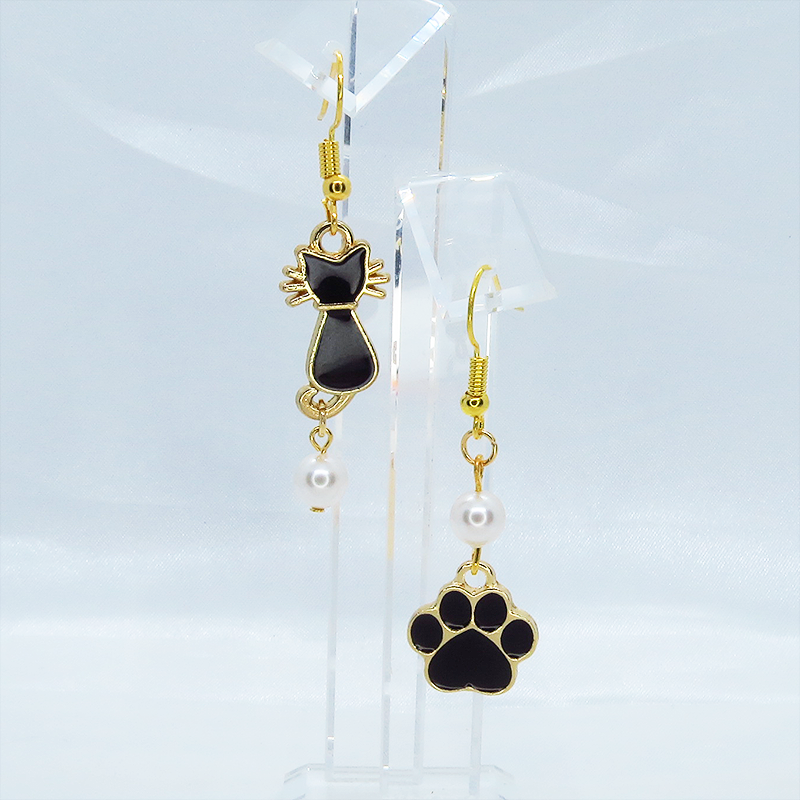 黒猫と肉球モチーフのアシンメトリーピアス ゴールドカラー エナメル スワロフスキーパール サージカル変更可