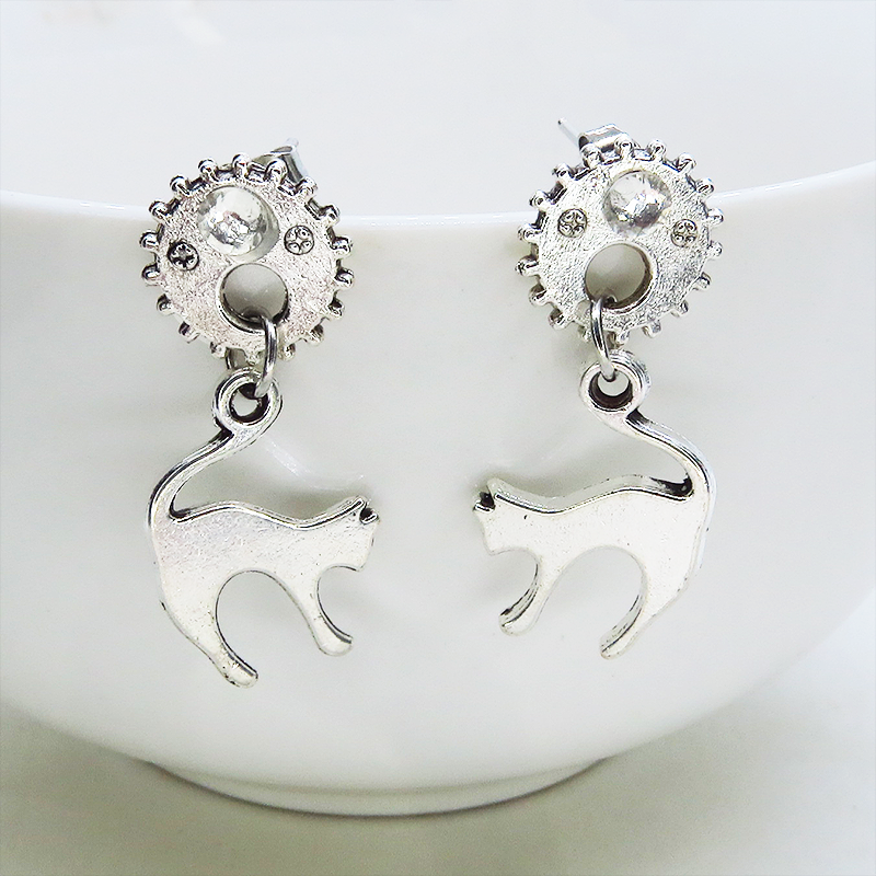 アンティークシルバーの跳ね猫のモチーフと歯車をつなげたシンプルなスチームパンク風スタッドピアスです