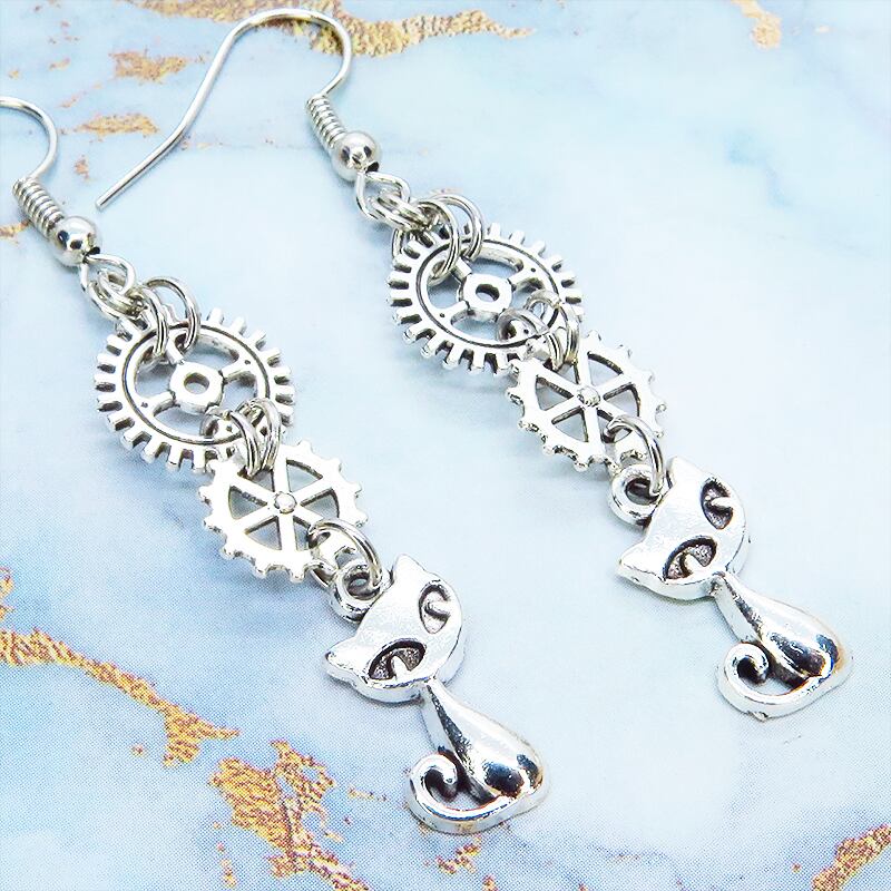 アンティークシルバーの猫と歯車のモチーフを組合せたスチームパンク風ピアスです