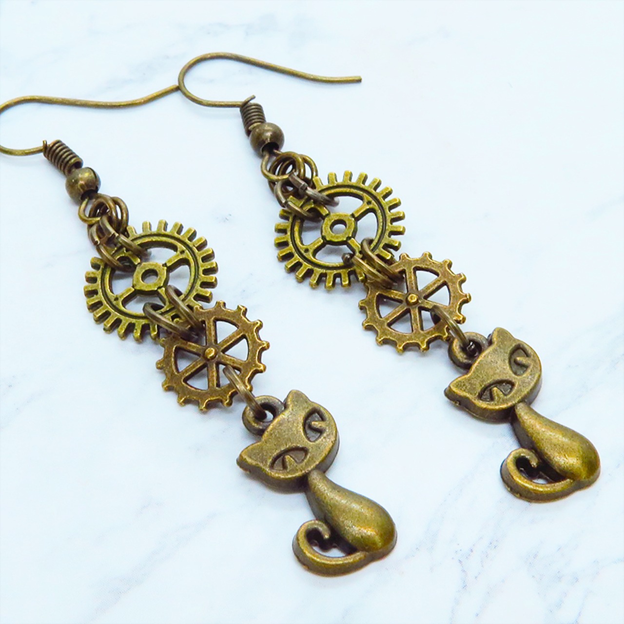 アンティークゴールドの猫と歯車のモチーフを組合せたスチームパンク風ピアスです