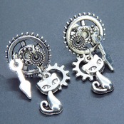 アンティークシルバーの猫と歯車を組合せたスチームパンク風のスタッドピアスです