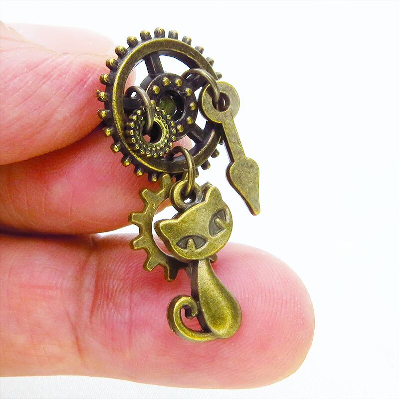 アンティークゴールドの猫と歯車を組合せたスチームパンク風のスタッドピアスです