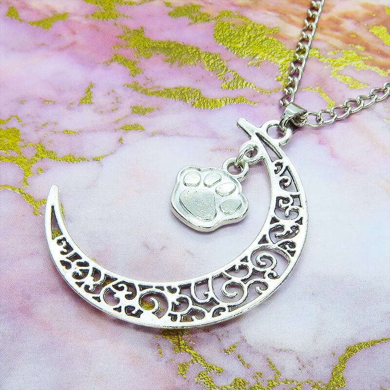 アンティークシルバー 透かし三日月と肉球の大人可愛いネックレス ムーンネックレス 猫 犬 銀古美