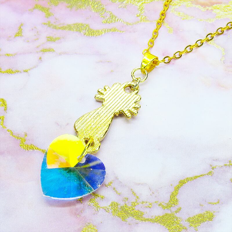 エナメルで黒猫を描いたゴールドカラーのモチーフにハート型の大きめスワロフスキー(クリスタルオーロラ)を組み合わせたペンダントネックレスです