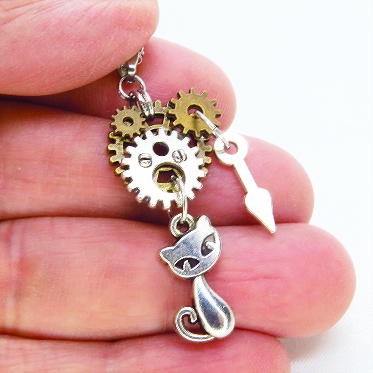 アンティークシルバー スチームパンク風 猫と歯車のコンパクトなペンダントネックレス 長さ調整可 SV925可 アジャスター可