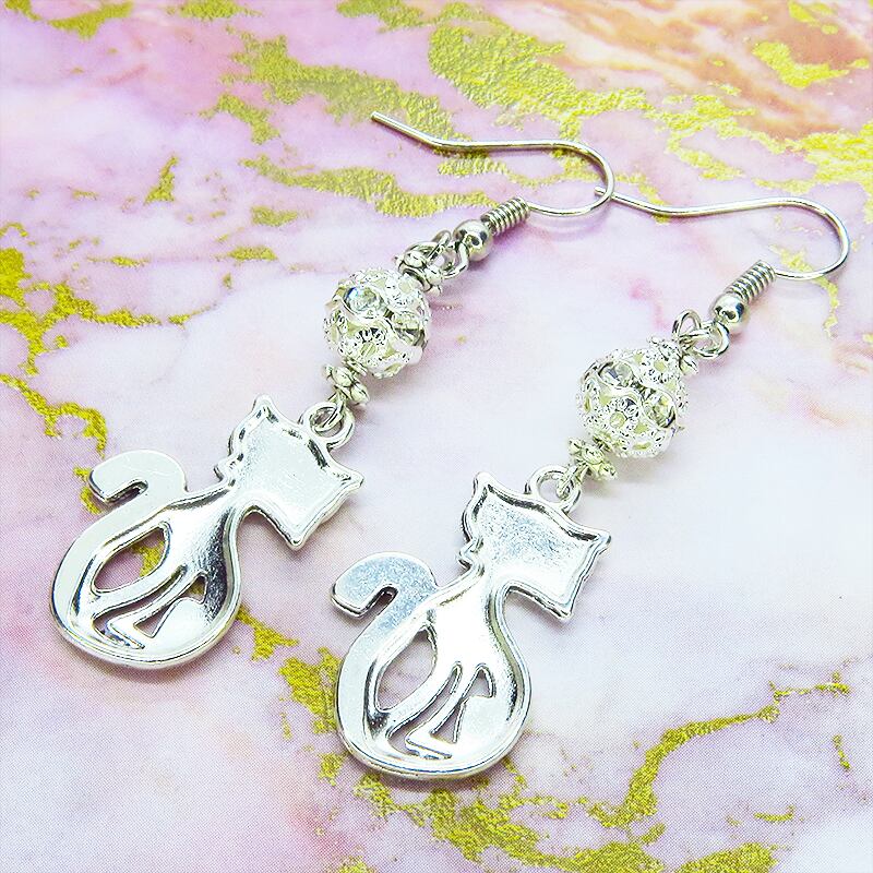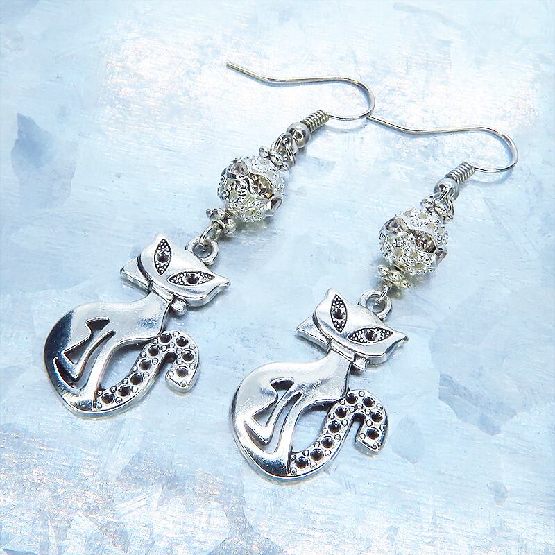 アンティークシルバーカラーのオリエンタル風のエキゾチックな猫モチーフとラインストーン入りのメタルビーズを組合せたピアスです
