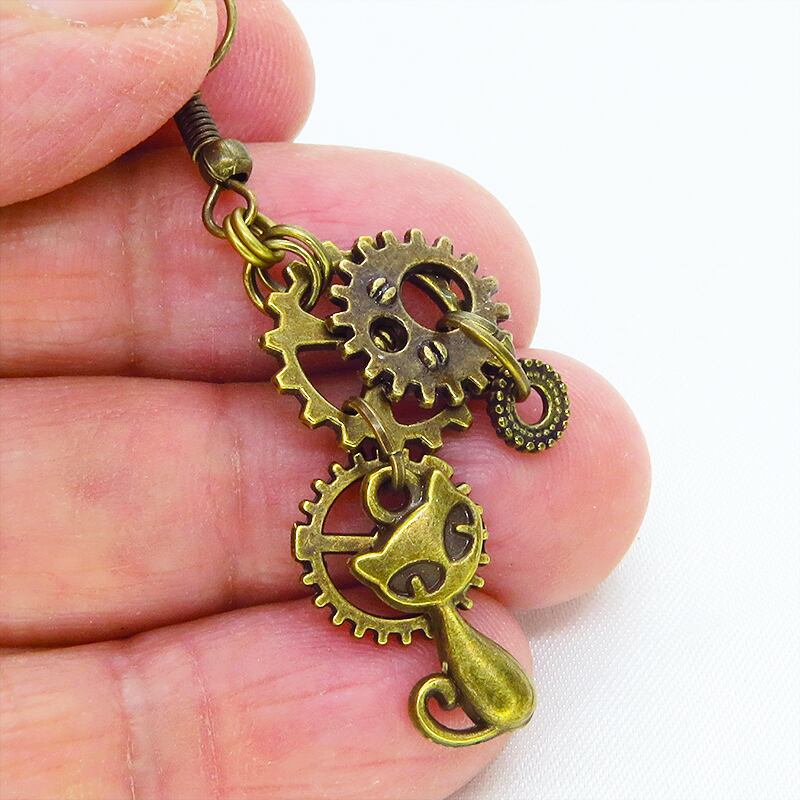猫と歯車を組合せたスチームパンク風のピアスです