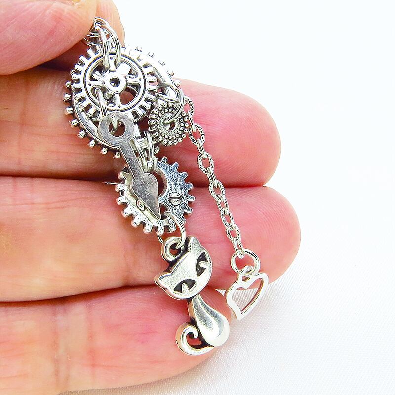 アンティークシルバー スチームパンク風 猫と歯車を組合せたチェーンピアス ハート 吊り下げ サージカル可