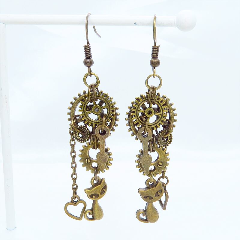 アンティークゴールド スチームパンク風 猫と歯車を組合せたチェーンピアス ハート 吊り下げ