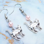 アンティークシルバー 歩き猫シルエットモチーフとスワロフスキーパール(ロザリン:淡いピンク)のピアス サージカル可