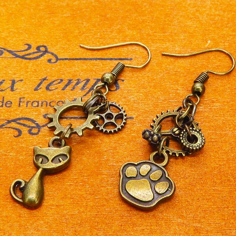 アンティークゴールド 猫と肉球に歯車を組合せたスチームパンク風アシンメトリーピアス