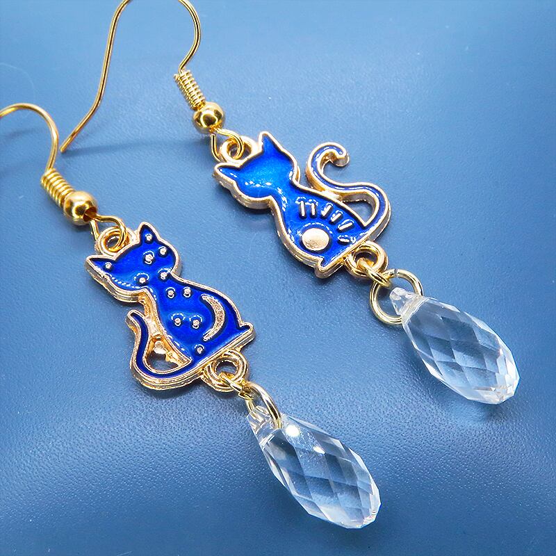 エナメルの青い猫モチーフにお日様と夜空の三日月を描いた左右で異なる絵柄の大人可愛いピアスです