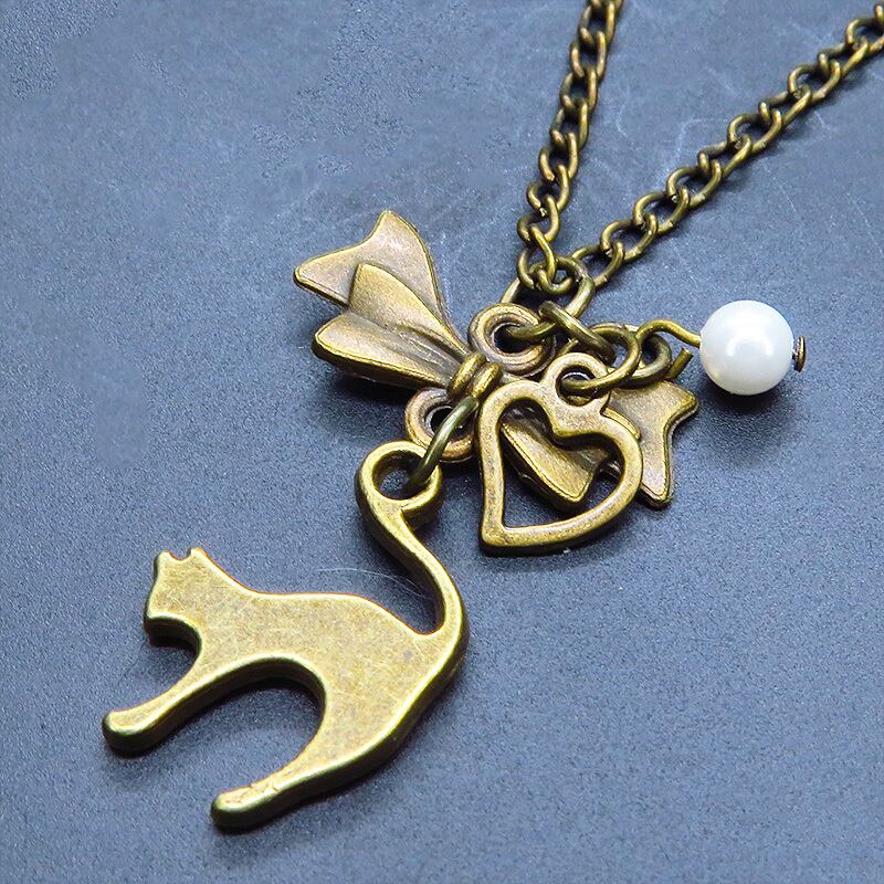 アンティークゴールド 跳ね猫とリボンのコンパクトなネックレス ガラスパール(ホワイト) 長さ調整可