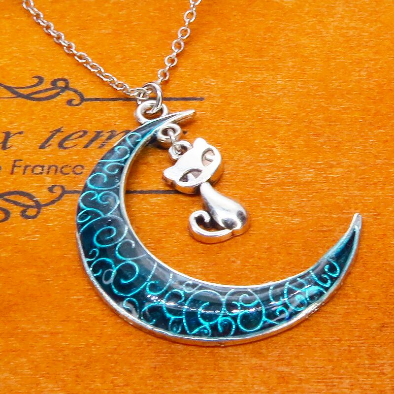 アクアマリンのカラーの三日月に猫のチャームをつりさげた大人可愛いペンダントネックレスです