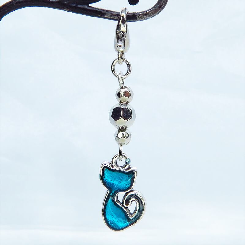 アンティークシルバーに縁取られた蒼い猫のチャームとメタルビーズを組合せたコンパクトなチャームです
