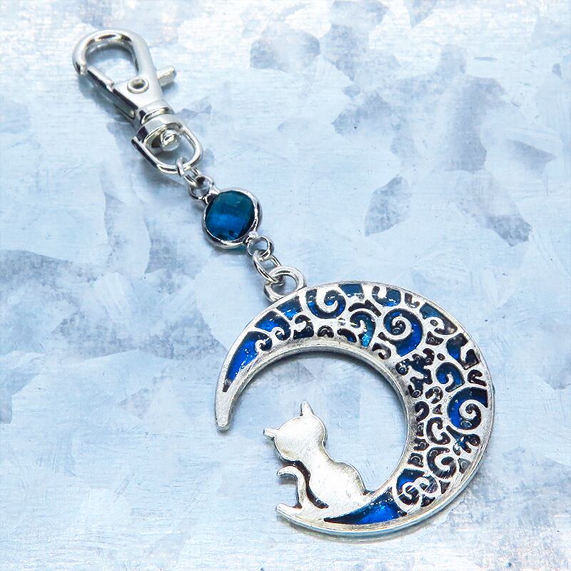 マリンブルー 猫が座る三日月チャームとラインストーンのキーホルダー バッグチャーム レジン 金具変更可